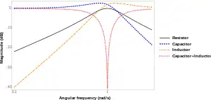 Bode magnitude plot for the voltage across the elements of an RLC series circuit. Natural frequency ω0 = 1 rad/s, damping ratio ζ = 0.4. The capacitor voltage peaks below the circuit's natural frequency, the inductor voltage peaks above the natural frequency, and the resistor voltage peaks at the natural frequency with a peak gain of one. The gain for the voltage across the capacitor and inductor combined in series shows antiresonance, with gain going to zero at the natural frequency.