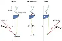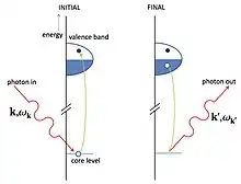 RIXS is a two steps process. First an electron is resonantly excited from a core level, defined by the absorption edge, to an empty state, leaving a core hole. The intermediate state with the core hole has a lifetime of few femtoseconds, then the system radiatively decays into the final state with the filling of the core hole and the emission of another photon. Since the probability of a radiative core hole relaxation is low, the RIXS cross section is very small and a high brilliance X-ray source is needed. Being a second order process, the RIXS cross section is described by the Kramers-Heisenberg formula.[1][5]