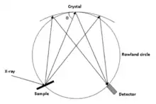 The optical layout for hard X-rays RIXS spectrometers is different. The spectrometers are based on spherical crystal analyzers (typically more than one to increase the solid angle of the spectrometer) exploiting Bragg reflections and on a position sensitive detector, typically in the so called Rowland geometry. This means that the source (X-rays spot on the sample), the analyzers and the detector must sit on the Rowland circle. By scanning the positions of the analyzers and of the detector (the source is fixed for convenience) the Bragg condition is changed and thus the energy of the scattered X-rays can be analyzed. By increasing the radius of the Rowland circle, the energy resolution can be increased, loosing in terms of efficiency. Nevertheless, as opposed to soft X-rays spectrometers, the resolving power of the spectrometer is limited by the crystal analyzers. Thus, increasing too much the dimensions of the spectrometer does not pay off.[18][22][23]