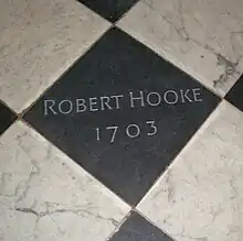 Hooke died in London on 3 March 1703, having been blind and bedridden during the last year of his life. A chest containing £8,000 in money and gold was found in his room at Gresham College.[83][lower-alpha 11] His library contained over 3,000 books in Latin, French, Italian and English.[83] Although he had talked of leaving a generous bequest to the Royal Society, which would have given his name to a library, laboratory and lectures, no will was found and the money passed to a cousin named Elizabeth Stephens.[84] Hooke was buried at St Helen's Church, Bishopsgate, in the City of London[85] but the precise location of his grave is unknown.