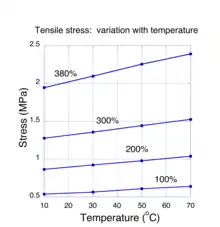 For molecular systems in thermal equilibrium, the addition of energy. e. g. by mechanical work, can cause a change in entropy. This is known from the theories of thermodynamics and statistical mechanics. Specifically, both theories assert that the change in energy must be proportional to the entropy change times the absolute temperature. This rule is only valid so long as the energy is restricted to thermal states of molecules. If a rubber sample is stretched far enough, energy may reside in non-thermal states such as the distortion of chemical bonds and the rule doesn't apply. At low to moderate strains, theory predicts that the required stretching force is due to a change in entropy in the network chains. If this is correct, then we expect that the force necessary to stretch a sample to some value of strain should be proportional to the temperature of the sample. Measurements showing how the tensile stress in a stretched rubber sample varies with temperature are shown in Fig. 4. In these experiments,[18] the strain of a stretched rubber sample was held fixed as the temperature was varied between 10 and 70 degrees Celsius. For each value of fixed strain, it is seen that the tensile stress varied linearly (to within experimental error). These experiments provide the most compelling evidence that entropy changes are the fundamental mechanism for rubber elasticity. The positive linear behavior of the stress with temperature sometimes leads to the mistaken notion that rubber has a negative coefficient of thermal expansion, i.e. the length of a sample shrinks when heated. Experiments[19] have shown conclusively that, like almost all other materials, the coefficient of thermal expansion natural rubber is positive.