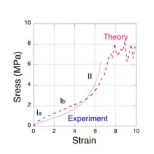 There are three distinct molecular mechanisms that produce these forces, two of which arise from changes in entropy that we shall refer to as low chain extension regime, Ia[5] and moderate chain extension regime, Ib.[6] The third mechanism occurs at high chain extension, as it is extended beyond its initial equilibrium contour length by the distortion of the chemical bonds along its backbone. In this case, the restoring force is spring-like and we shall refer to it as regime II.[7] The three force mechanisms are found to roughly correspond to the three regions observed in tensile stress vs. strain experiments, shown in Fig. 1.