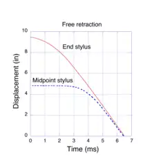 When we stretch a piece of rubber, e.g. a rubber band, we notice that it deforms uniformly, lengthwise. Every element along its length experiences the same extension factor as the entire sample. If we release one end, the sample snaps back to its original length very rapidly, too fast for our eye to resolve the process. Our intuitive expectation is that it returns to its original length in the same manner as when it was stretched, i. e. uniformly. However, this is not what happens. Experimental observations by Mrowca et al.[20] show a surprising behavior. To capture the extremely fast retraction dynamics, they utilized a clever experimental method devised by Exner and Stefan[21] in 1874, well before high-speed electronic measuring devices were invented. Their method consisted of a rapidly rotating glass cylinder which, after being coated with lamp black, was placed next to the stretched rubber sample. Styli, attached to the mid-point and free end of the rubber sample, were held in contact with the glass cylinder. Then, as the free end of the rubber snapped back, the styli traced out helical paths in the lamp black coating of the rotating cylinder. By adjusting the rotation speed of the cylinder, they could record the position of the styli in less than one complete rotation. The trajectories were transferred to a graph by rolling the cylinder on a piece of damp blotter paper. The mark left by a stylus appeared as a white line (no lamp black) on the paper. Their data, plotted as the graph in Fig. 5, shows the position of end and midpoint styli as the sample rapidly retracts to its original length. The sample was initially stretched 9.5” beyond its unstrained length and then released. The styli returned to their original positions (displacement of 0”) in a little over 6 ms. The linear behavior of the displacement vs. time indicates that, after a brief acceleration, both the end and the midpoint of the sample snapped back at a constant velocity of about 50 m/s or 112 mph. However, the midpoint stylus did not start to move until about 3 ms after the end was released. Evidently, the retraction process travels as a wave, starting at the free end. At high extensions some of the energy stored in the stretched network chain is due to a change in its entropy, but most of the energy is stored in bond distortions (regime II, above) which do not involve an entropy change. If one assumes that all of the stored energy is converted to kinetic energy, the retraction velocity may be calculated directly from the familiar conservation equation E = 1⁄2 mv2. Numerical simulations,[11] based on the Molecular Kink paradigm, predict velocities consistent with this experiment.