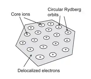 Rydberg matter[1] is an exotic phase of matter formed by Rydberg atoms; it was predicted around 1980 by É. A. Manykin, M. I. Ozhovan and P. P. Poluéktov.[2][3] It has been formed from various elements like caesium,[4] potassium,[5] hydrogen[6][7] and nitrogen;[8] studies have been conducted on theoretical possibilities like sodium, beryllium, magnesium and calcium.[9] It has been suggested to be a material that diffuse interstellar bands may arise from.[10] Circular[11] Rydberg states, where the outermost electron is found in a planar circular orbit, are the most long-lived, with lifetimes of up to several hours,[12] and are the most common.[13][14][15]