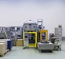 GLORIA (GLObal ReactIon Array) is a configuration used in SEC to measure fragments produced in reactions. It consists of six silicon telescopes, which surround a certain scattering angle of the reaction target (from 15° to 160°.[7][8] GLORIA was designed to have a compact geometry with the ability to resolve mass and ion charge up to carbon isotopes, due to the two-stage DSSD telescopes.[8]