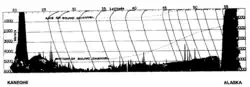 This phenomenon is an important factor in ocean surveillance.[5][6][7] The deep sound channel was discovered and described independently by Maurice Ewing and J. Lamar Worzel at Columbia University and Leonid Brekhovskikh at the Lebedev Physics Institute in the 1940s.[8][9] In testing the concept in 1944 Ewing and Worzel hung a hydrophone from Saluda, a sailing vessel assigned to the Underwater Sound Laboratory, with a second ship setting off explosive charges up to 900 nmi (1,000 mi; 1,700 km) away.[10][11]