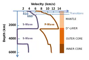 - Poisson, S. D. (1831). "Mémoire sur la propagation du mouvement dans les milieux élastiques" [Memoir on the propagation of motion in elastic media]. Mémoires de l'Académie des Sciences de l'Institut de France (in French). 10: 549–605. From p.595: "On verra aisément que cet ébranlement donnera naissance à deux ondes sphériques qui se propageront uniformément, l'une avec une vitesse a, l'autre avec une vitesse b ou a / √3" ... (One will easily see that this quake will give birth to two spherical waves that will be propagated uniformly, one with a speed a, the other with a speed b or a /√3 ... ) From p.602: ... "à une grande distance de l'ébranlement primitif, et lorsque les ondes mobiles sont devenues sensiblement planes dans chaque partie très-petite par rapport à leurs surfaces entières, il ne subsiste plus que des vitesses propres des molécules, normales ou parallèles à ces surfaces ; les vitesses normal ayant lieu dans les ondes de la première espèce, où elles sont accompagnées de dilations qui leur sont proportionnelles, et les vitesses parallèles appartenant aux ondes de la seconde espèce, où elles ne sont accompagnées d'aucune dilatation ou condensation de volume, mais seulement de dilatations et de condensations linéaires." ( ... at a great distance from the original quake, and when the moving waves have become roughly planes in every tiny part in relation to their entire surface, there remain [in the elastic solid of the Earth] only the molecules' own speeds, normal or parallel to these surfaces ; the normal speeds occur in waves of the first type, where they are accompanied by expansions that are proportional to them, and the parallel speeds belonging to waves of the second type, where they are not accompanied by any expansion or contraction of volume, but only by linear stretchings and squeezings.)