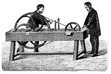 Hooke's device was not used again for study purposes for over a century.[9] Its next documented usage was in 1830 when Savart reported his use of a system similar to Hooke's which he developed while investigating the lower range of human hearing.[11][12] Savart's specific contribution was to attach a tachometer to the axis of the toothed wheel to facilitate calibration of the tooth rate.[9] Savart used his wheel as a practical alternative to John Robison's siren, which was also being adopted at the time by Charles Cagniard de la Tour to test the range of human hearing.[13] By 1834 Savart was constructing brass wheels with a width of 82 cm, containing as many as 720 teeth.[9] These wheels, which could produce frequencies up to 24 kHz, have been tentatively proposed as the first artificial generators of ultrasound.[11]