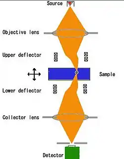 The sample is illuminated by a focused electron beam, and the beam is re-focused on the detector, thus collecting only electrons passing through the focus. In order to produce an image, the beam should be laterally scanned. In the original design, this was achieved by placing synchronized scanning and descanning deflectors. Such design is complex and only a few custom-built setups exist. Another approach is to use stationary illumination and collection, but perform scan by moving the sample with a high-precision piezo-controlled holder. Such holders are readily available and can fit into most commercial electron microscopes thereby realizing the SCEM mode. As a practical demonstration, atomically resolved SCEM images have been recorded.[6][7]