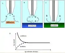 In a bulk solution, the oxidized species is reduced at the tip, producing a steady-state current that is limited by hemispherical diffusion. As the tip approaches a conductive substrate in the solution, the reduced species formed at the tip is oxidized at the conductive surface, yielding an increase in the tip current and creating a regenerative "positive" feedback loop.[6] The opposite effect is observed when probing insulating surfaces, as the oxidized species cannot be regenerated and diffusion to the electrode is inhibited as a result of physical obstruction as the tip approaches the substrate, creating a "negative" feedback loop and decreasing the tip current. An additional parameter to consider when probing insulating surfaces is the electrode sheath diameter, rg, since it contributes to the physical obstruction of diffusion.