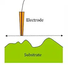 SECM probes use platinum as the active core material, however carbon, gold, mercury, and silver have all been used.[25] Typical preparation of a microscale electrode is performed by heat sealing a microwire or carbon fiber in a glass capillary under vacuum. This tip can be connected to a larger copper electrode through the use of silver epoxy then polished to yield a sharpened tip. Nanofabrication of electrodes can be performed by etching a metal wire with sodium cyanide and sodium hydroxide. Etched metal wires can then be coated with wax, varnish, molten paraffin or glass, poly(a-methylstyrene), polyimide,[26] electropolymerized phenol, and electrophoretic paint.[27] Nanotips produced by these methods are conical, however disc-shaped tips can be obtained by micropipette pulling of glass sealed electrodes. Nanoscale electrodes allow for high resolution experiments of biological features of sub micron scale or single molecule analysis. "Penetration" experiments, where the tip is inserted into a microstructure (such as a thin polymer film with fixed redox centers) to probe kinetic and concentration parameters, also require the use of nanoscale electrodes.[28] However, microelectrodes remain ideal for quantitative kinetic and feedback mode experiments due to their increased surface area.