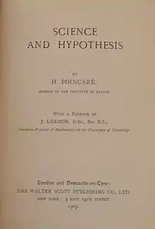 Science and Hypothesis (French: La Science et l'Hypothèse) is a book by French mathematician Henri Poincaré, first published in 1902. Aimed at a non-specialist readership, it deals with mathematics, space, physics and nature.[1][2][3] It puts forward the theses that absolute truth in science is unattainable, and that many commonly held beliefs of scientists are held as convenient conventions rather than because they are more valid than the alternatives.[4]