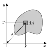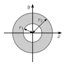 Consider an annulus whose center is at the origin, outside radius is , and inside radius is . Because of the symmetry of the annulus, the centroid also lies at the origin. We can determine the polar moment of inertia, , about the axis by the method of composite shapes. This polar moment of inertia is equivalent to the polar moment of inertia of a circle with radius minus the polar moment of inertia of a circle with radius , both centered at the origin. First, let us derive the polar moment of inertia of a circle with radius with respect to the origin. In this case, it is easier to directly calculate as we already have , which has both an and component. Instead of obtaining the second moment of area from Cartesian coordinates as done in the previous section, we shall calculate and directly using polar coordinates.