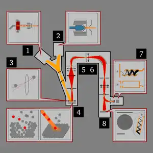 Schematic of a typical dynamic SIMS instrument. High energy (usually several keV) ions are supplied by an ion gun (1 or 2) and focused on to the target sample (3), which ionizes and sputters some atoms off the surface (4). These secondary ions are then collected by ion lenses (5) and filtered according to atomic mass (6), then projected onto an electron multiplier (7, top), Faraday cup (7, bottom), or CCD screen (8).