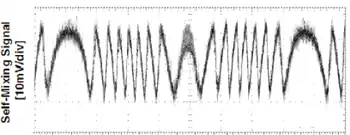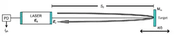 Self-mixing or back-injection laser interferometry is an interferometric technique in which a part of the light reflected by a vibrating target is reflected into the laser cavity, causing a modulation both in amplitude and in frequency of the emitted optical beam. In this way, the laser becomes sensitive to the distance traveled by the reflected beam thus becoming a distance, speed or vibration sensor.[1] The advantage compared to a traditional measurement system is a lower cost thanks to the absence of collimation optics and external photodiodes.[2][3]