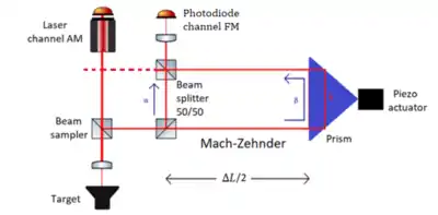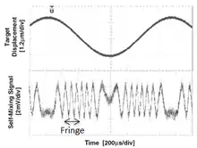In this type of interferometric configuration the fact is exploited that a small fraction of the light emitted by a laser, after having been reflected by a vibrating target, is re-injected into the laser cavity, where a sort of coherent radiation detection is realized: the power emitted by the laser is in fact modulated both in amplitude (AM) and in frequency (FM), generating a fringes interferometric signal.[4] This signal is a periodic function of the phase of the back-scattered field, according to the following relation: