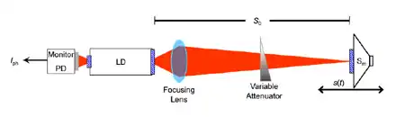 The amplitude modulation (AM) of the emitted optical power is detected by the photodiode of monitor (PD) inside the laser package. In this particular interferometric technique the resolution of the displacement and vibration measurement is limited by a low signal-to-noise radio or SNR, such that the system is only suitable for slow and wide measurements .[6]