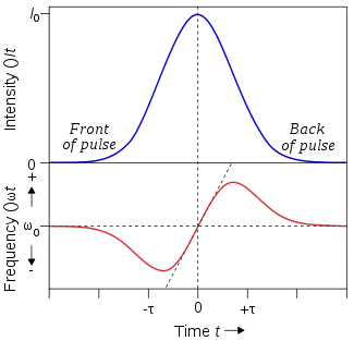 Plotting ω(t) shows the frequency shift of each part of the pulse. The leading edge shifts to lower frequencies ("redder" wavelengths), trailing edge to higher frequencies ("bluer") and the very peak of the pulse is not shifted. For the centre portion of the pulse (between t = ±τ/2), there is an approximately linear frequency shift (chirp) given by: