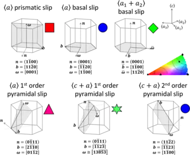 Diffraction methods cannot generally resolve the slip plane of a residual dislocation. For example, in Zr, the screw components of 〈𝑎〉 dislocations could slip on prismatic, basal, or 1st-order pyramidal planes. Similarly, 〈𝑐 + 𝑎〉 screw dislocations could slip on either 1st or 2nd order pyramidal planes.[5]