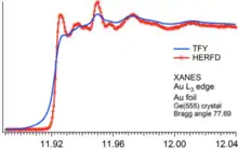 In synchrotron facilities those measurement can be done at the same time, yet the experiment setup is quite complex and needs exact and fine tuned crystal monochromators to diffract the tangential beam coming from the electron storage ring. Method is called HERFD, which stands for High Energy Resolution Fluorescence Detection. The collection method is unique in that, after a collection of all wavelengths coming from "the source" called , the beam is then shone onto the sample holder with a detector behind it for the XANES part of the measurement. The sample itself starts to emit X-rays and after those photons have been monochromatized they are collected, too. Most setups use at least three crystal monochromators or more. The is used in absorption measurements as a part of the Beer-Lambert Law in the equation