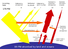 The Earth receives 174 petawatts (PW) of incoming solar radiation (insolation) at the upper atmosphere.[6] Approximately 30% is reflected back to space while the rest, 122 PW, is absorbed by clouds, oceans and land masses. The spectrum of solar light at the Earth's surface is mostly spread across the visible and near-infrared ranges with a small part in the near-ultraviolet.[7] Most of the world's population live in areas with insolation levels of 150–300 watts/m2, or 3.5–7.0 kWh/m2 per day.[8]
