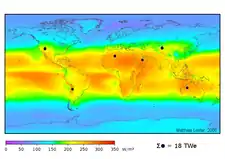Average insolation. The theoretical area of the small black dots is sufficient to supply the world's total energy needs of 18 TW with solar power.