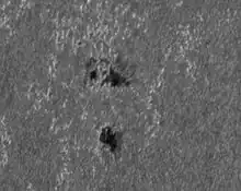 Sun's faculae. Dark regions are sunspots and the brighter speckled regions around them are faculae. Although image is in grayscale, it correctly presents true white color of Sun's photosphere.