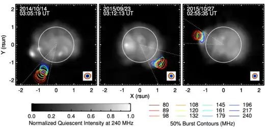 Like Type II bursts, Type IIIs also drift from high to low frequencies and are widely attributed to the plasma emission mechanism.[78] However, Type III bursts drift much more rapidly, around 100 MHz per second, and must therefore be related to disturbances that move more quickly than the shock waves responsible for Type IIs.[79] Type III bursts are associated with electrons beams that are accelerated to small fractions of light speed ( 0.1 to 0.3 c) by magnetic reconnection, the process responsible for solar flares. In the image below, the chain of color contours show the locations of three Type III bursts at different frequencies. The progression from violet to red corresponds to the trajectories of electron beams moving away from the Sun and exciting lower and lower frequency plasma emission as they encounter lower and lower densities. Given that they are ultimately caused by magnetic reconnection, Type IIIs are strongly associated with X-ray flares and are indeed observed during nearly all large flares.[80] However, small-to-moderate X-ray flares do not always exhibit Type III bursts and vice versa due to the somewhat different conditions that are required for the high- and low-energy emission to be produced and observed.[81][82]