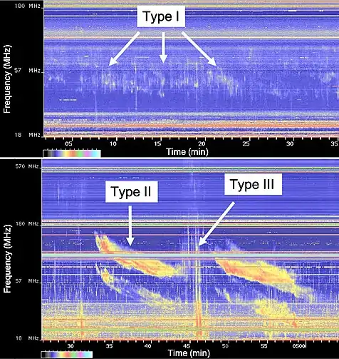 Solar radio bursts are classified largely based on how they appear in dynamic spectrum observations from radiospectrographs. The first three types, shown in the image on the right, were defined by Paul Wild and Lindsay McCready in 1950 using the earliest radiospectrograph observations of metric (low-frequency) bursts.[8] This classification scheme is based primarily on how a burst's frequency drifts over time. Types IV and V were added within a few years of the initial three, and a number of other types and sub-types have since been identified.