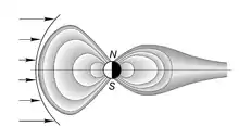 Where the solar wind intersects with a planet that has a well-developed magnetic field (such as Earth, Jupiter or Saturn), the particles are deflected by the Lorentz force. This region, known as the magnetosphere, causes the particles to travel around the planet rather than bombarding the atmosphere or surface. The magnetosphere is roughly shaped like a hemisphere on the side facing the Sun, then is drawn out in a long wake on the opposite side. The boundary of this region is called the magnetopause, and some of the particles are able to penetrate the magnetosphere through this region by partial reconnection of the magnetic field lines.[31]