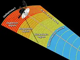 On December 13, 2010, Voyager 1 determined that the velocity of the solar wind, at its location 10.8 billion miles (17.4 billion kilometres) from Earth had slowed to zero. "We have gotten to the point where the wind from the Sun, which until now has always had an outward motion, is no longer moving outward; it is only moving sideways so that it can end up going down the tail of the heliosphere, which is a comet-shaped-like object", said Voyager project scientist Edward Stone.[27][28]