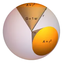 In the International System of Units (SI), a solid angle is expressed in a dimensionless unit called a steradian (symbol: sr). One steradian corresponds to one unit of area on the unit sphere surrounding the apex, so an object that blocks all rays from the apex would cover a number of steradians equal to the total surface area of the unit sphere, . Solid angles can also be measured in squares of angular measures such as degrees, minutes, and seconds.