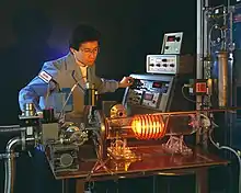 Because of its direct relevance to products of commerce, solid state inorganic chemistry has been strongly driven by technology. Progress in the field has often been fueled by the demands of industry, sometimes in collaboration with academia.[2] Applications discovered in the 20th century include zeolite and platinum-based catalysts for petroleum processing in the 1950s, high-purity silicon as a core component of microelectronic devices in the 1960s, and “high temperature” superconductivity in the 1980s. The invention of X-ray crystallography in the early 1900s by William Lawrence Bragg was an enabling innovation. Our understanding of how reactions proceed at the atomic level in the solid state was advanced considerably by Carl Wagner's work on oxidation rate theory, counter diffusion of ions, and defect chemistry. Because of his contributions, he has sometimes been referred to as the father of solid state chemistry.[3]