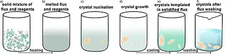 Molten flux synthesis can be an efficient method for obtaining single crystals. In this method, the starting reagent are combined with flux, an inert material with a melting point lower than that of the starting materials. The flux serves as a solvent. After the reaction, the excess flux can be washed away using an appropriate solvent or it can be heat again to remove the flux by sublimation if it is a volatile compound.