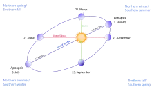 The seasons (with the transition points of the June solstice, September equinox, December solstice, and March equinox) and Earth's orbit characteristics.