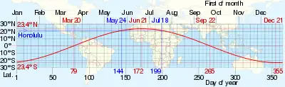 Approximate subsolar point dates vs latitude superimposed on a world map, the example in blue denoting Lahaina Noon in Honolulu