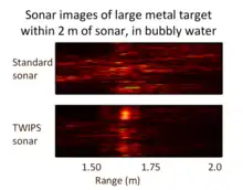 The scattering of sonar from objects (mines, pipelines, zooplankton, geological features, fish etc.) is how active sonar detects them, but this ability can be masked by strong scattering from false targets, or 'clutter'. Where they occur (under breaking waves;[40] in ship wakes; in gas emitted from seabed seeps and leaks[41] etc.), gas bubbles are powerful sources of clutter, and can readily hide targets. TWIPS (Twin Inverted Pulse Sonar)[42][43][44] is currently the only sonar that can overcome this clutter problem.