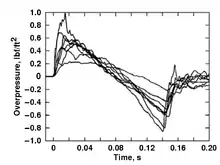 For today's supersonic aircraft in normal operating conditions, the peak overpressure varies from less than 50 to 500 Pa (1 to 10 psf (pound per square foot)) for an N-wave boom. Peak overpressures for U-waves are amplified two to five times the N-wave, but this amplified overpressure impacts only a very small area when compared to the area exposed to the rest of the sonic boom. The strongest sonic boom ever recorded was 7,000 Pa (144 psf) and it did not cause injury to the researchers who were exposed to it. The boom was produced by an F-4 flying just above the speed of sound at an altitude of 100 feet (30 m).[5] In recent tests, the maximum boom measured during more realistic flight conditions was 1,010 Pa (21 psf). There is a probability that some damage—shattered glass, for example—will result from a sonic boom. Buildings in good condition should suffer no damage by pressures of 530 Pa (11 psf) or less. And, typically, community exposure to sonic boom is below 100 Pa (2 psf). Ground motion resulting from the sonic boom is rare and is well below structural damage thresholds accepted by the U.S. Bureau of Mines and other agencies.[6]