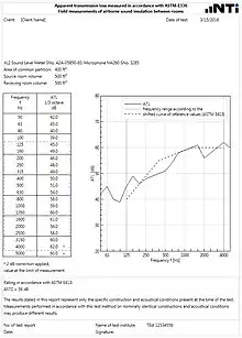 The sound isolation performance of a partition measured in the field according to ASTM E336, normalized to account for different room finishes and the area of the tested partition (i.e. compare the same wall measured in a bare living room and an acoustically dry recording booth).
