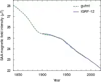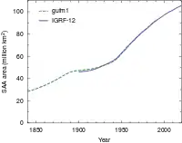 The area of the SAA is confined by the intensity of Earth's magnetic field at less than 32,000 nanotesla at sea level,[1] which corresponds to the dipolar magnetic field at ionospheric altitudes.[2] However, the field itself varies in intensity as a gradient.[1]: Figure 1