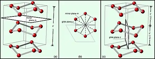 A glide plane is a reflection in a plane, followed by a translation parallel with that plane. This is noted by , , or , depending on which axis the glide is along. There is also the glide, which is a glide along the half of a diagonal of a face, and the glide, which is a fourth of the way along either a face or space diagonal of the unit cell. The latter is called the diamond glide plane as it features in the diamond structure. In 17 space groups, due to the centering of the cell, the glides occur in two perpendicular directions simultaneously, i.e. the same glide plane can be called b or c, a or b, a or c. For example, group Abm2 could be also called Acm2, group Ccca could be called Cccb. In 1992, it was suggested to use symbol e for such planes. The symbols for five space groups have been modified: