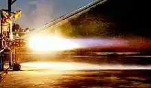 Rocket engines provide essentially the highest specific powers and high specific thrusts of any engine used for spacecraft propulsion. Most rocket engines are internal combustion heat engines (although non-combusting forms exist).[39] Rocket engines generally produce a high-temperature reaction mass, as a hot gas, which is achieved by combusting a solid, liquid or gaseous fuel with an oxidiser within a combustion chamber.[40] The extremely hot gas is then allowed to escape through a high-expansion ratio bell-shaped nozzle, a feature that gives a rocket engine its characteristic shape.[39] The effect of the nozzle is to dramatically accelerate the mass, converting most of the thermal energy into kinetic energy,[41] where exhaust speeds reaching as high as 10 times the speed of sound at sea level are common.