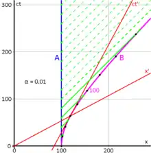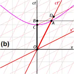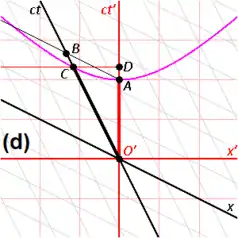 - In the upper picture the place for W2 is taken to be Ax > 0, and thus the worldline (not shown in the pictures) of this clock intersects the worldline of the moving clock (the ct′-axis) in the event labelled A, where "two clocks are simultaneously at one place". In the lower picture the place for W′2 is taken to be Cx′ < 0, and so in this measurement the moving clock W passes W′2 in the event C.
