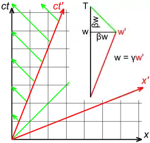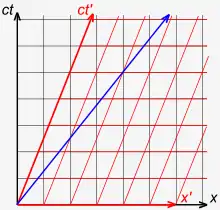 Each line drawn parallel to a spatial axis (x, x′) represents a line of simultaneity. All events on such a line have the same time value (ct, ct′). Likewise, each line drawn parallel to a temporal axis (ct, ct′) represents a line of equal spatial coordinate values (x, x′).