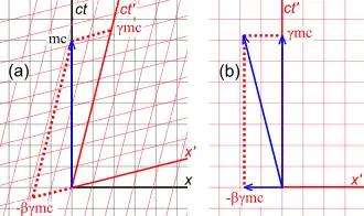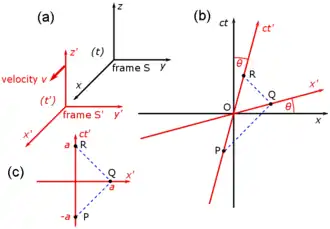 Fig. 2-3a redraws Fig. 2-2 in a different orientation. Fig. 2-3b illustrates a relativistic spacetime diagram from the viewpoint of observer O. Since S and S′ are in standard configuration, their origins coincide at times t = 0 in frame S and t′ = 0 in frame S′. The ct′ axis passes through the events in frame S′ which have x′ = 0. But the points with x′ = 0 are moving in the x-direction of frame S with velocity v, so that they are not coincident with the ct axis at any time other than zero. Therefore, the ct′ axis is tilted with respect to the ct axis by an angle θ given by[31]: 23–31