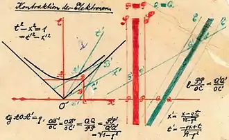 When Einstein published in 1905, another of his competitors, his former mathematics professor Hermann Minkowski, had also arrived at most of the basic elements of special relativity. Max Born recounted a meeting he had made with Minkowski, seeking to be Minkowski's student/collaborator:[25]