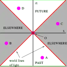 The light cone has an essential role within the concept of causality. It is possible for a not-faster-than-light-speed signal to travel from the position and time of O to the position and time of D (Fig. 2-4). It is hence possible for event O to have a causal influence on event D. The future light cone contains all the events that could be causally influenced by O. Likewise, it is possible for a not-faster-than-light-speed signal to travel from the position and time of A, to the position and time of O. The past light cone contains all the events that could have a causal influence on O. In contrast, assuming that signals cannot travel faster than the speed of light, any event, like e.g. B or C, in the spacelike region (Elsewhere), cannot either affect event O, nor can they be affected by event O employing such signalling. Under this assumption any causal relationship between event O and any events in the spacelike region of a light cone is excluded.[35]