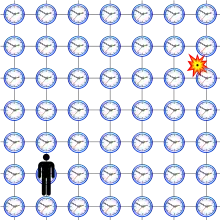 In this idealized case, every point in space has a clock associated with it, and thus the clocks register each event instantly, with no time delay between an event and its recording. A real observer, will see a delay between the emission of a signal and its detection due to the speed of light. To synchronize the clocks, in the data reduction following an experiment, the time when a signal is received will be corrected to reflect its actual time were it to have been recorded by an idealized lattice of clocks.[9]: 17–22