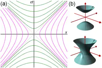 Fig. 2-7b reflects the situation in (1+2)-dimensional Minkowski spacetime (one temporal and two spatial dimensions) with the corresponding hyperboloids. The invariant hyperbolae displaced by spacelike intervals from the origin generate hyperboloids of one sheet, while the invariant hyperbolae displaced by timelike intervals from the origin generate hyperboloids of two sheets.