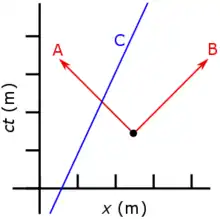 A spacetime diagram is typically drawn with only a single space and a single time coordinate. Fig. 2-1 presents a spacetime diagram illustrating the world lines (i.e. paths in spacetime) of two photons, A and B, originating from the same event and going in opposite directions. In addition, C illustrates the world line of a slower-than-light-speed object. The vertical time coordinate is scaled by so that it has the same units (meters) as the horizontal space coordinate. Since photons travel at the speed of light, their world lines have a slope of ±1.[31]: 23–25 In other words, every meter that a photon travels to the left or right requires approximately 3.3 nanoseconds of time.